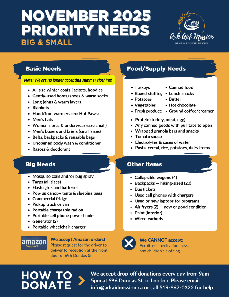 From basic outreach needs to big items, donate today and make a meaningful difference in the lives of others—no donation is too big or too small! We accept donations every day from 9am–5pm at our main location (696 Dundas St). This list is updated monthly.