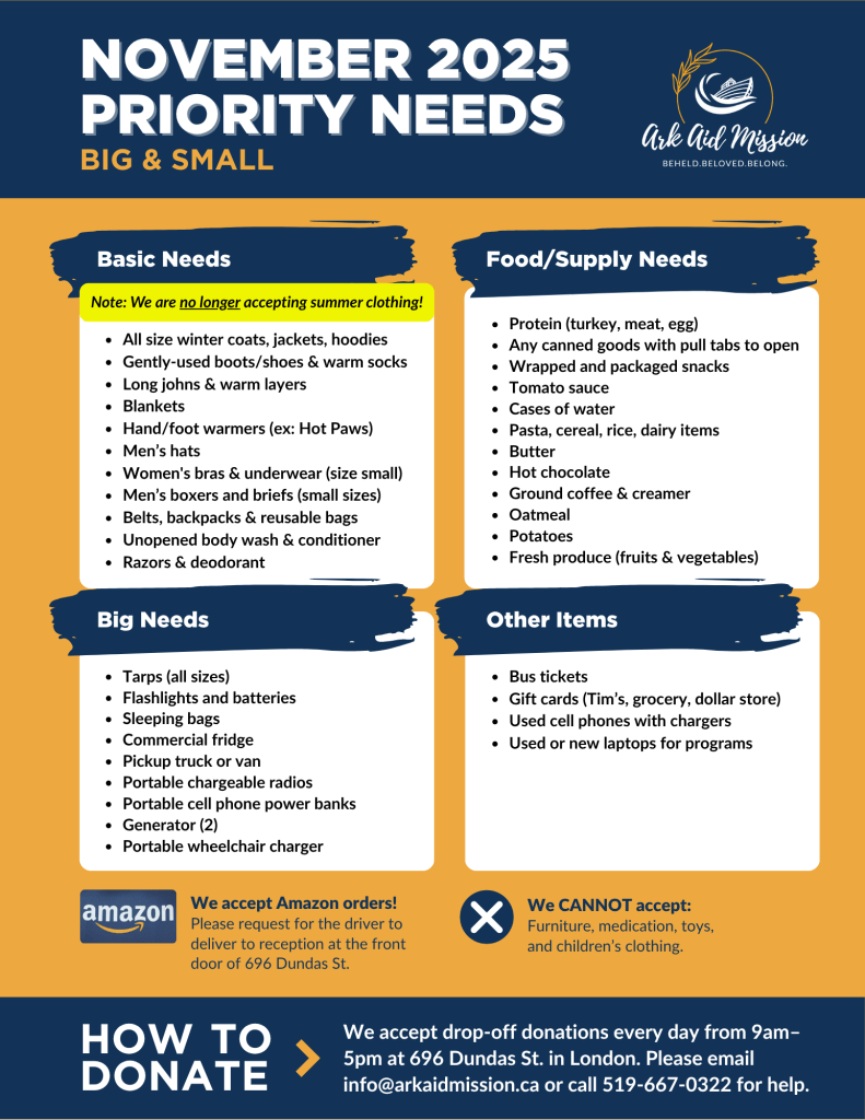 From basic outreach needs to big items, donate today and make a meaningful difference in the lives of others—no donation is too big or too small! We accept donations every day from 9am–5pm at our main location (696 Dundas St). This list is updated monthly.